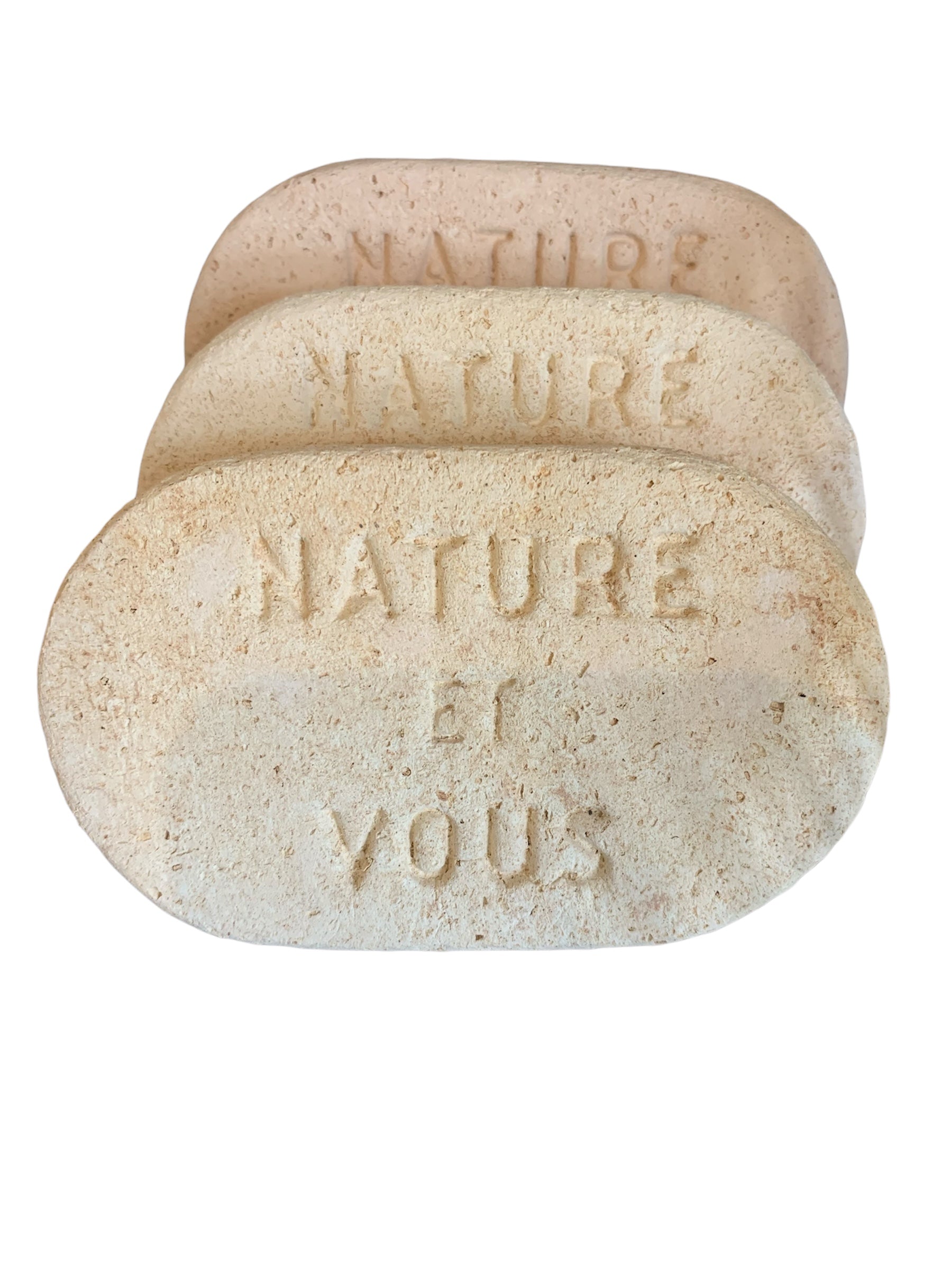 Nettoyage de la pierre: Laisser quelques minutes dans l’eau bouillante, brosser, rincer sous l’eau, puis laisser sécher.
